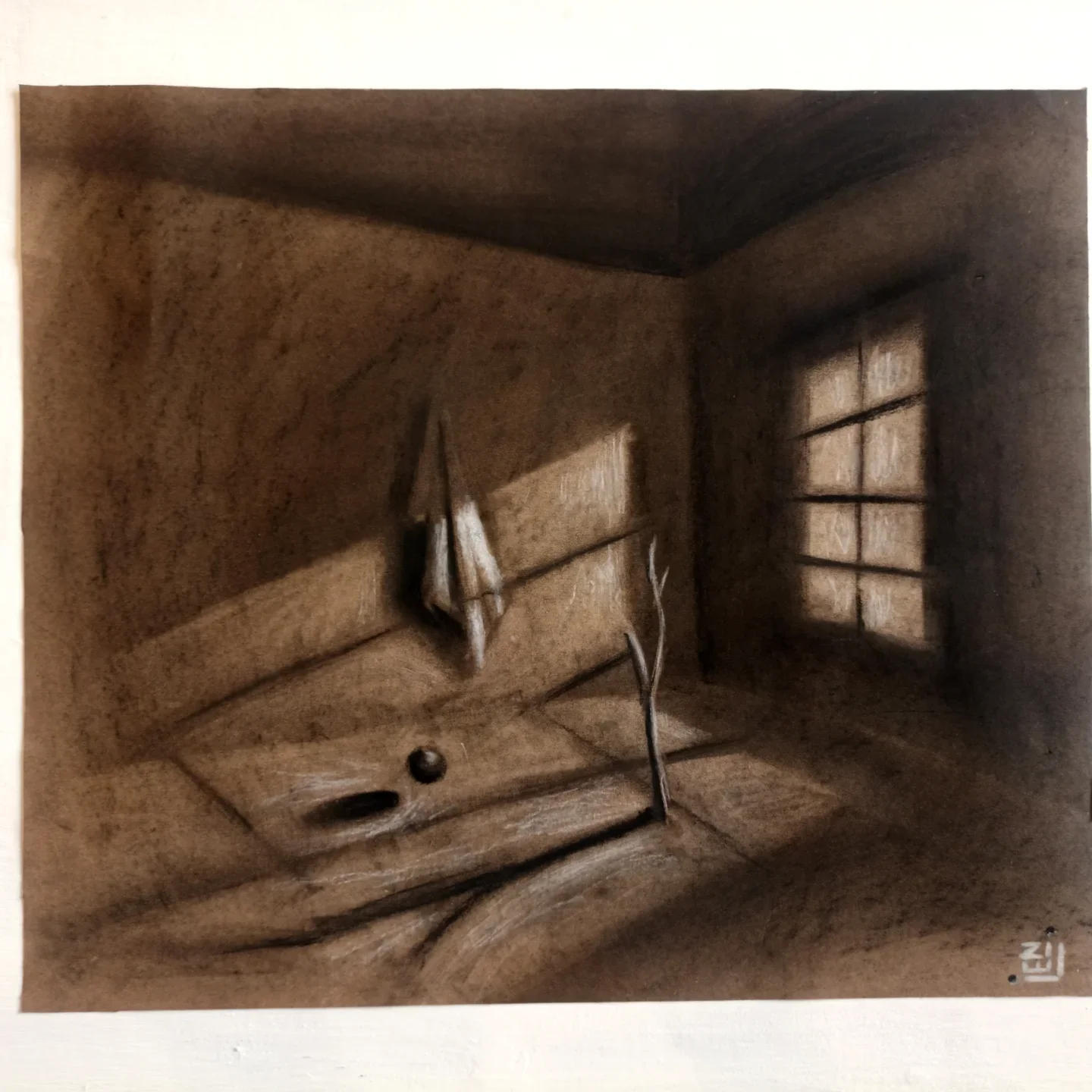 Onz avril, Charcoal on tinted paper, Zilien, 2025