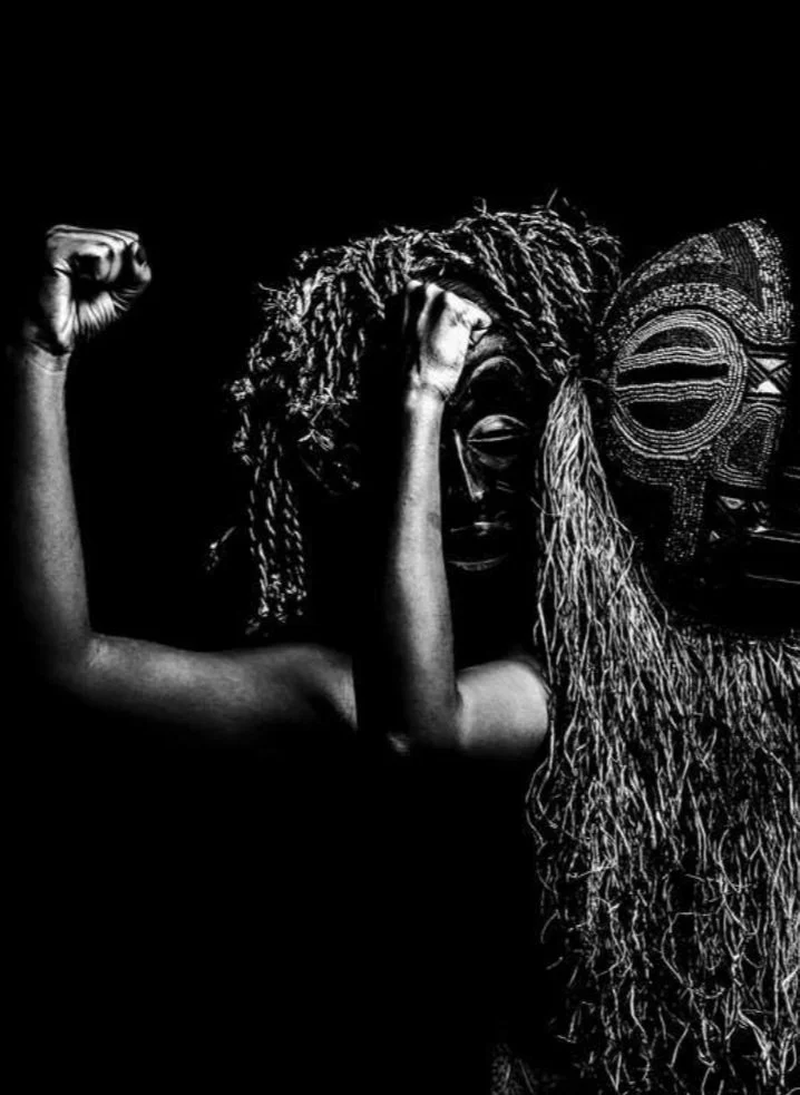 Black and white photo of a woman with curly hair, flexing her arm and lifting her fist, alongside a tribal mask with intricate patterns and long, textured hair.